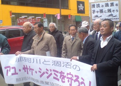 霞ケ浦導水事業の那珂川取水口(水戸市)の着工は「漁業権を侵害する」として茨城、栃木両県の那珂川関係漁協は3月3日、仮処分決定が出るのを待たずに国を相手取った建設差し止めの本裁判に踏み切り、水戸地裁に訴状を提出しました。本裁判には河口の涸沼(ひぬま)でシジミ漁をしている大涸沼漁協が新たに加わりました。