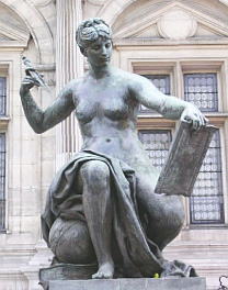 私たちがパリ滞在中、世界陸上選手権大会が開かれていて、パリ市庁舎前広場がマラソンのスタート点になった。私と同行のN氏がここを訪れたのは、マラソンの2日前である8月28日の午前9時過ぎだった。市庁舎を前にして、私とN氏は「うーん、これは凄い!」と思わずつぶやいた。 去年見たミュンヘン市庁舎にも驚かされたが、こちらはそれを上回るものがあった。壁面には歴代の首長なのだろうか、多数の立像がはめ込まれてあった。「「この建物はおそらく、パリ コミューン(1871年)の頃からのものだと思う」とN氏は言った。 建物の前面に二つの裸婦像がたっていた。右手にコンパスを持ち、足元に地球儀と本を配したこの像は、これまでみた裸婦像の中でも特に印象に残るものとなった。 |
