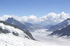(5)ヨーロッパ最高峰に登る この旅の4 日目 私たち5人は、ベルンからユングフラウ・ヨッホ(お嬢さんの山という意味)の日帰りの旅を楽しんだ。 なにしろ3,571mの頂上まで電車で登ってしまうのだから凄い。しかも、このトンネルをくり貫いた登山電車道は100年以上前に作ったという。 地球温暖化のせいか、氷河には大きな亀裂がはいり、雪解け水が滝となって流れ落ちていた。 |